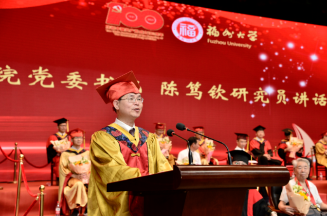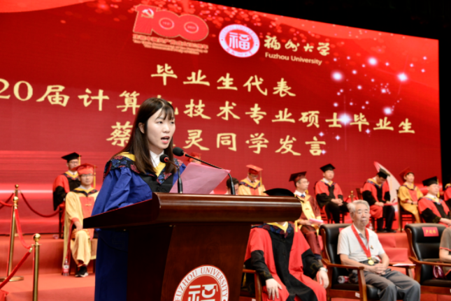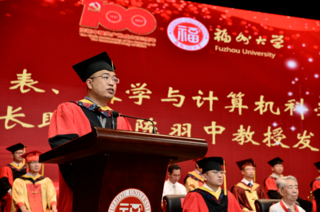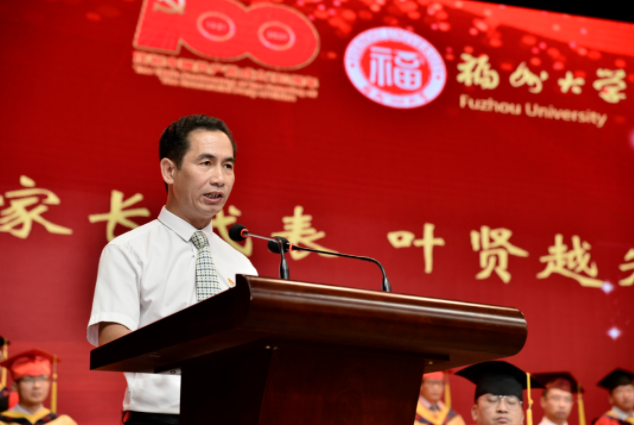 首先,学院院长助理陈羽中教授作为教师代表向大家致辞。他对广大学子顺利完成学业,开启人生新篇章表示衷心地祝贺,同时期待毕业生们在未来的人生道路上,学会换位思考、自知自省,用积极乐观的心态面对工作和生活,享受工作带来的乐趣和成就感,做到干一行爱一行。
