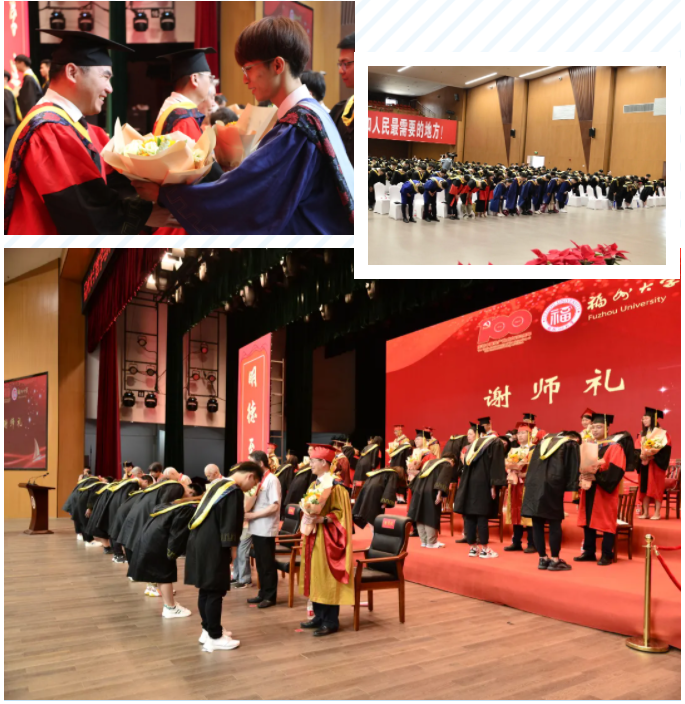 接着,举行庄重的谢师礼,25名毕业生代表登台向老师们献上鲜花,全场毕业生起立,共同向老师们三鞠躬,向学院全体老师致以崇高敬意,感谢正直严谨的师长倾囊相授,启迪思想,感谢博大优雅的母校温暖注视,宽容培育。