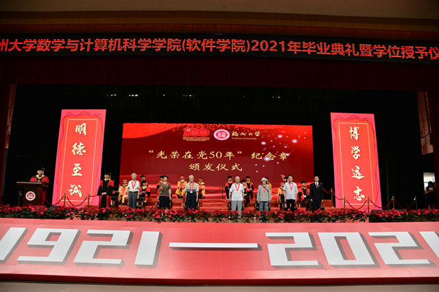 在毕业典礼上举行“光荣在党50年”纪念章颁发仪式,既是全院师生感激和铭记党员老教师们的爱岗敬业、拼搏担当和无私奉献,也为毕业生们上了离校前的重要一课,鞭策同学们接过时代的‘接力棒’,以老一辈党员为标杆与榜样,不忘初心,牢记使命,传承红色基因,弘扬艰苦奋斗精神,更加坚定为祖国和党的建设事业贡献青春力量的信念,在百年党史中汲取奋进力量,积极投身于实际工作中,为实现“十四五”规划和二○三五年远景目标汇聚磅礴力量。
