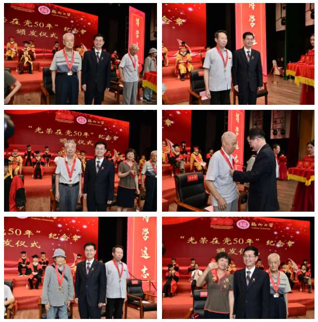 有6位党员老教师荣获该纪念章。他们分别是:计算机系退休教师、国家级专家、两度荣获福建省“劳动模范”称号的康金章教授(党龄64年),数学系退休教师李淑英副教授(党龄63年),计算机系退休教师林啟宇老师(党龄60年),计算机系退休教师魏麟应老师(党龄59年),计算机系退休教师陈荣山副教授(党龄51年),计算机系退休教师李金炼副教授(党龄50年)。颁发仪式上,学院党委书记陈笃钦研究员逐一为老同志颁发纪念章(因特殊原因,李淑英老师的纪念章由卢旋珠老师代为领取),现场师生以雷鸣般的掌声为党员老教师们致以最崇高的敬意。