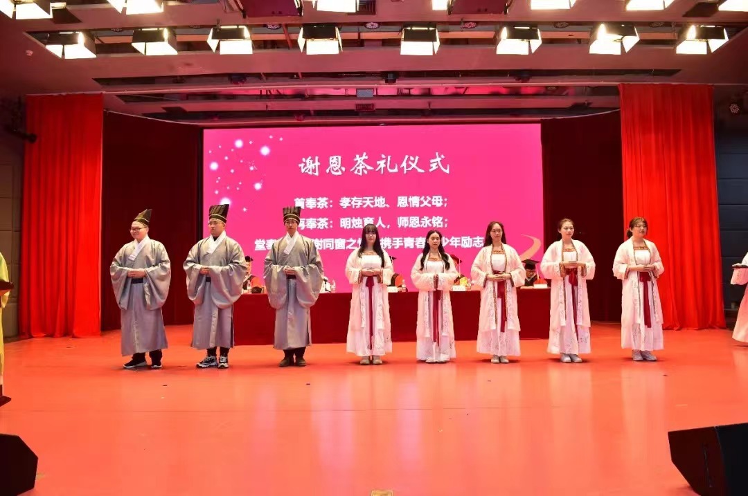 紧接着开始行谢恩茶礼,8位毕业生代表向陪伴大学生涯的老师、父母、同窗行叁奉茶礼。首奉茶——孝存天地、恩情父母,感谢父母一直以来的倾心付出;再奉茶——明烛育人,师恩永铭,致敬领导、老师们的倾力奉献;叁奉茶——敬谢同窗之情,携手青春,少年励志,感恩同窗相伴,相逢一如往昔。