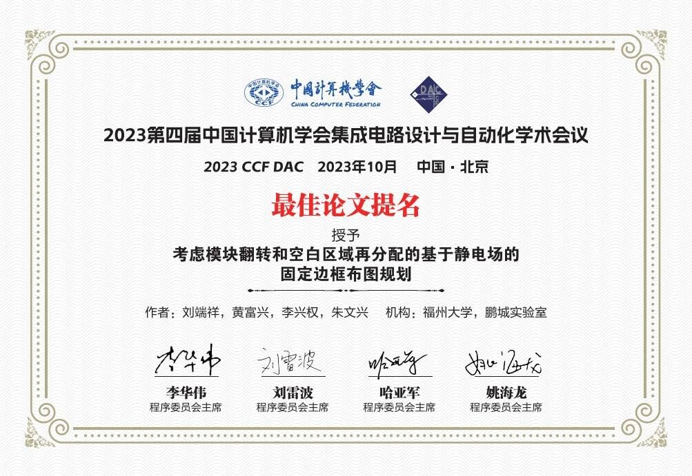 近日,中国计算机学会主办的第四届中国计算机学会集成电路设计与自动化学术会议(CCF Integrated Circuit Design and Automation Conference,简称:CCF-DAC)于2023年10月13日至10月16日在北京成功召开。在这次会议中,离散数学研究中心2021级硕士研究生刘端祥、黄富兴的论文《考虑模块翻转和空白区域再分配的基于静电场的固定边框布图规划》荣获大会最佳论文提名奖,指导教师为朱文兴教授和鹏城实验室李兴权副研究员。