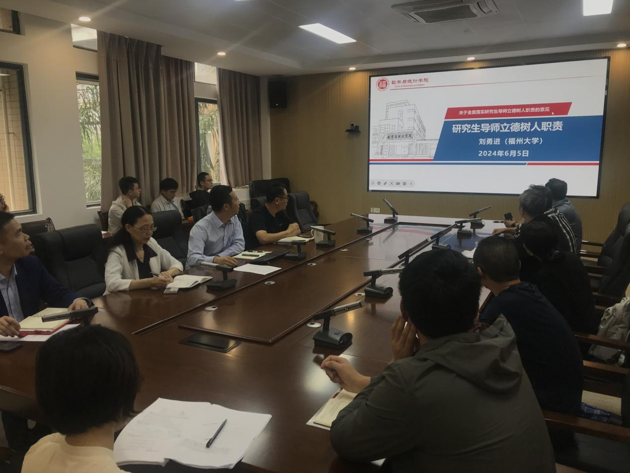 在院312室举办“研究生导师立德树人职责”专题报告会。院长刘勇进教授做专题报告,院党委书记郑世珠、党委副书记沈庆斌、副院长侯建锋以及学院研究生导师参加了本次报告会。