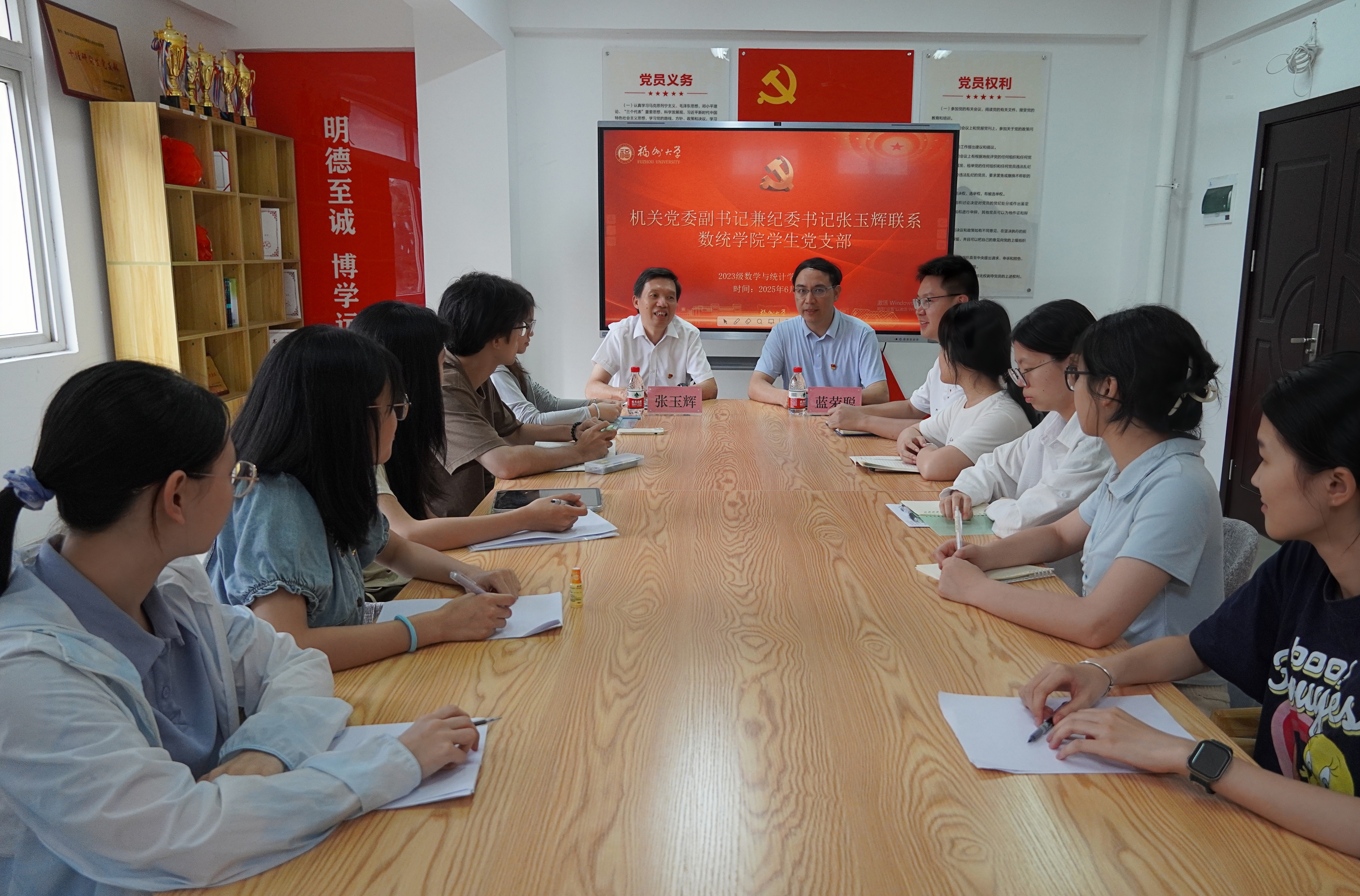 机关党委副书记兼纪委书记张玉辉在35号楼2楼“一站式”学生社区共享活动室,与所联系的2023级数学与统计学生党支部全体党员开展面对面座谈交流。学院党委副书记蓝荣聪、辅导员许佳琦一同参与。