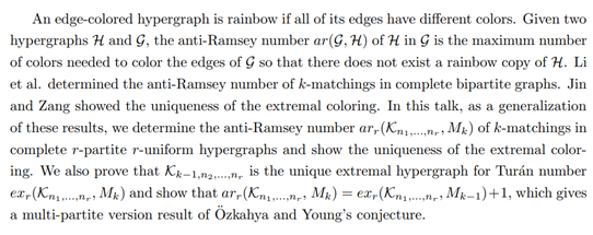 报告题目:Anti-Ramsey number of matchings in r-partite r-uniform hypergraphs