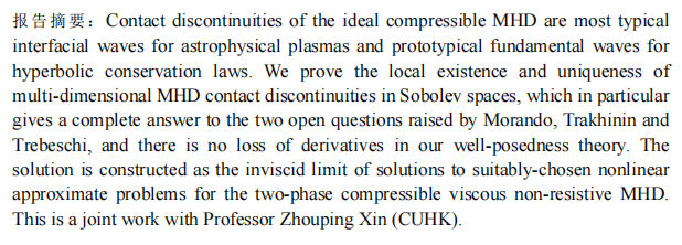 报告题目:Existence of Multi-dimensional MHD Contact Discontinuities