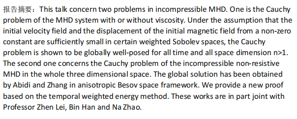 报告题目: On the global solutions for incompressible MHD near equilibrium