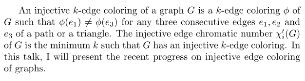 报告人简介:胡小兰,华中师范大学数学与统计学学院助理研究员,博士生导师。博士毕业于南京大学,研究方向为图论及其应用。曾于2013.09-2013.12 期间在美国西弗吉尼亚大学进行短期学术访问,2017.03-2018.09期间在捷克查理大学访问。主持国家自然科学基金青年项目和面上项目各1项,湖北省自然科学基金1项。 在Journal of Graph Theory,SIAM Journal on Discrete Mathematics, European Journal of Combinatorics等专业领域权威期刊发表学术论文三十多篇。