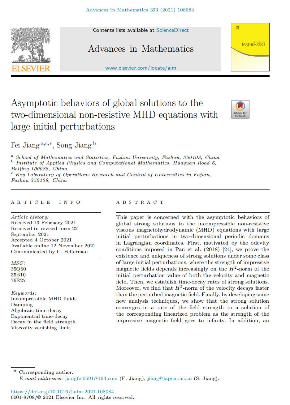 江飞教授和合作者在磁流体力学方程组领域的最新研究成果《Asymptotic behaviors of global solutions to the two-dimensional non-resistive MHD equations with large initial perturbations》发表在《Advances in Mathematics》。1988年Bardos等人在强磁场条件下给出无黏性且零电阻的磁流体力学方程组存在大扰动解。然而对应的有黏性情形一直悬而未决,其困难在于传统的双曲理论方法无法应用到有黏性情形下的抛物-双曲型混合结构。直到2016年,浙江大学张挺教授利用振荡积分理论和谱分析方法,对于二维情形,证明出有黏且零电阻的磁流体力学方程组存在大扰动解,并给出外加磁场强度趋于无穷大时,非线性运动方程组可收敛于线性方程组。江飞教授和合作者利用磁抑制机制的物理想法,在拉格朗日坐标下重证张挺教授的结果,并发现刻画磁流体粒子的偏移函数与外加磁场强度成反比的现象。这种反比关系的发现,被审稿人认为是本文最大亮点。因为利用该关系,可以进一步证明:非线性运动方程组在收敛于线性方程组时,存在关于外加磁场强度成反比的收敛率。