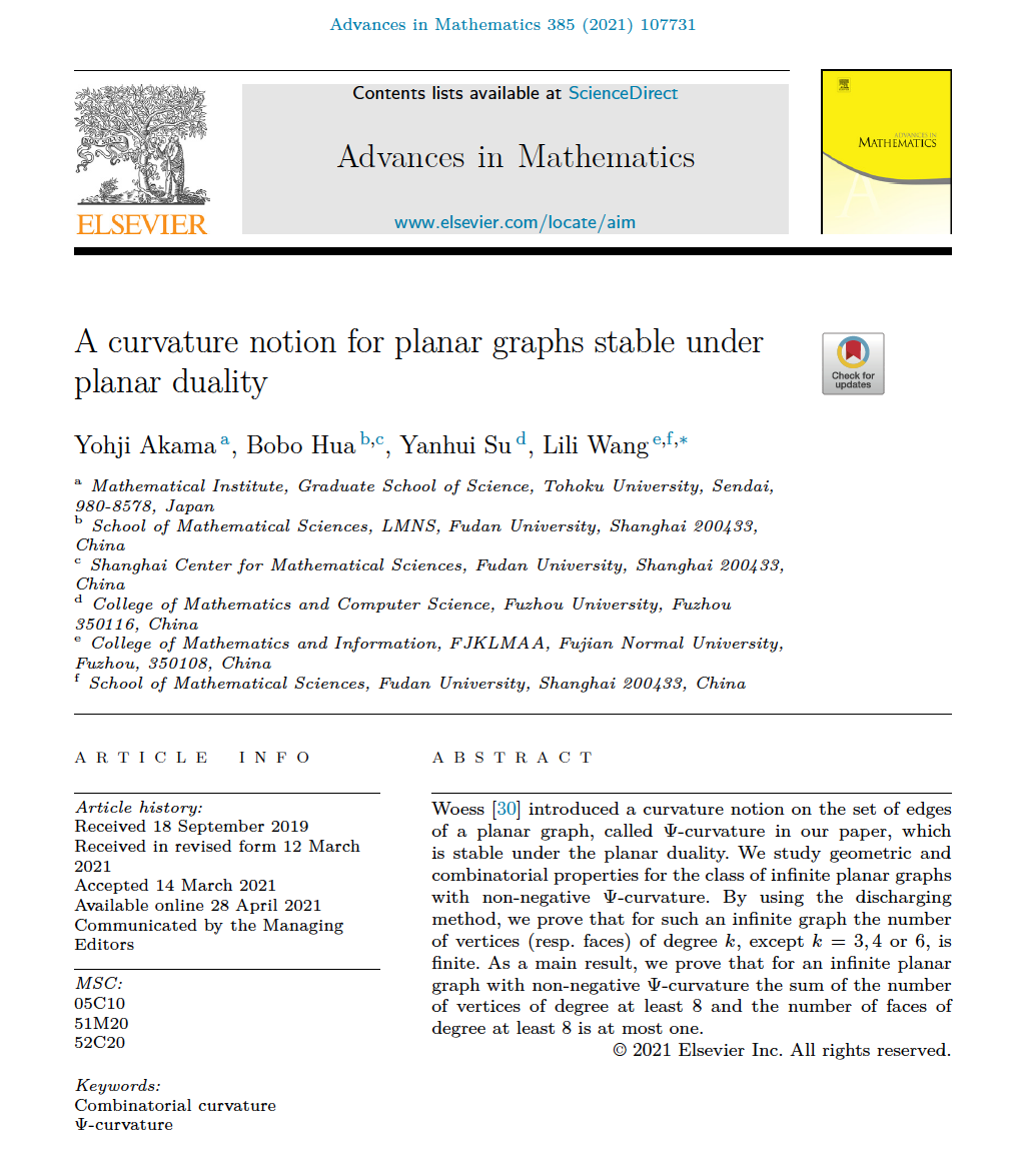 苏延辉副教授与日本东北大学Akama教授、复旦大学华波波教授、福建师范大学王丽莉老师合作的论文《A curvature notion for planar graphs stable under planar duality》发表在《Advances in Mathematics》上。