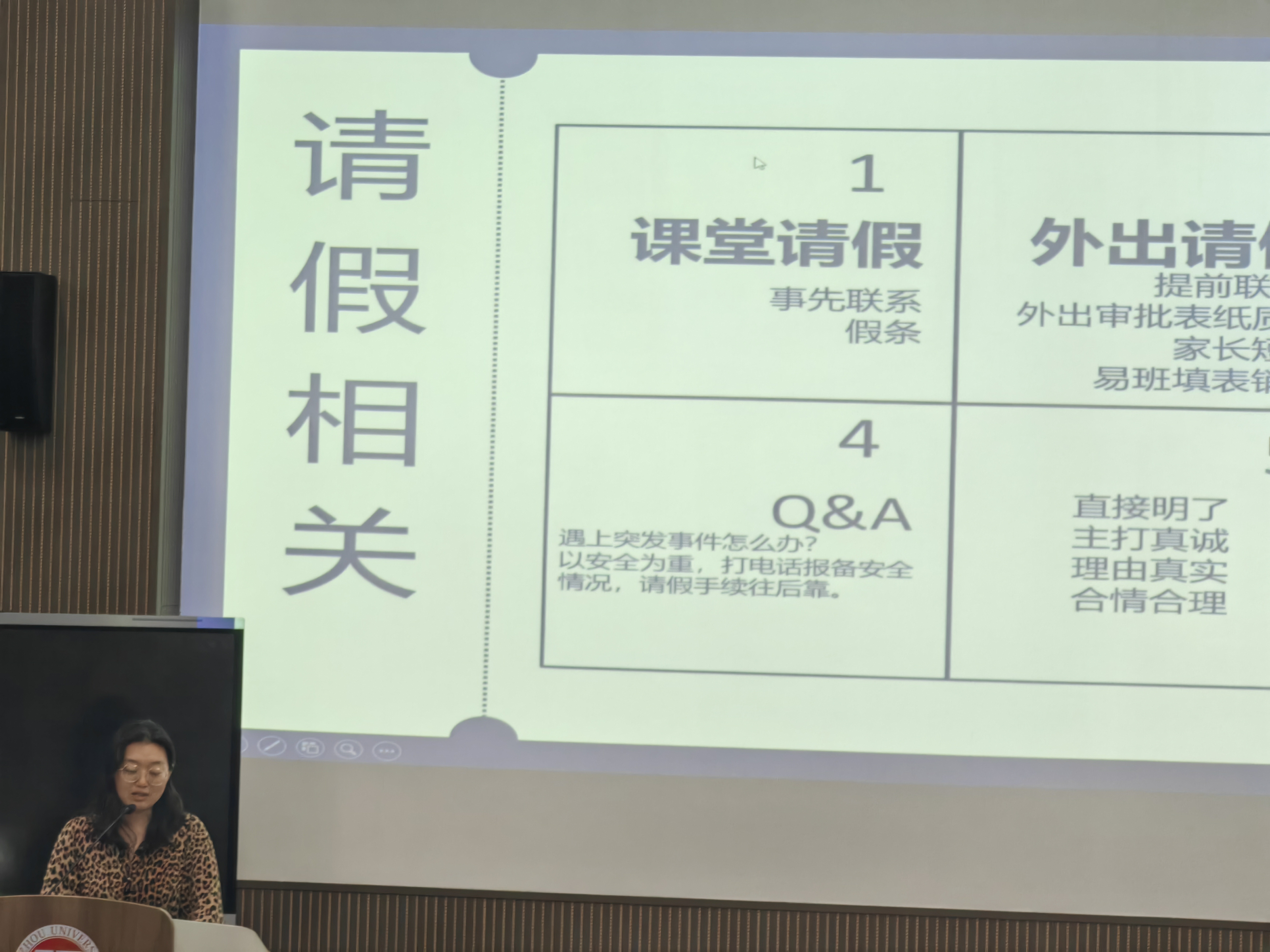 会上,舒婧妍老师对节日期间的请假流程等相关事宜进行了解读和强调,并针对宿舍安全、谨防电信诈骗及网络安全三个方面做了警示教育。最后,她就期末冲刺阶段的注意要点向在场同学进行了建言,提醒同学们要认真复习,不可消极懈怠;调整心态,缓解紧张情绪;沉着应试,确保诚信赶考。