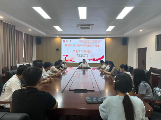 随后,学生骨干代表积极发言。他们首先向祖国送上了75周年的诚挚祝福,并依次汇报了个人在学习、工作、生活和思想方面的动态,提出了未来的规划及自我要求。2023级统计学研究生陈彧扬表示,他将严谨治学,为中华民族伟大复兴的中国梦贡献力量;2022级经济统计学本科生赵儒政和俞海玥均表示,要脚踏实地做好学习、工作、生活上的每一件事,为中华民族的伟大复兴贡献青春力量;2023级数学类本科生林煊皓则表示,他将深耕专业知识,提升学业成绩,同时积极参加党组织活动,将个人理想融入国家发展大局之中。