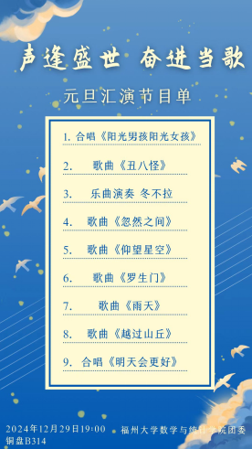 于12月29日在铜盘B314举办了元旦汇演暨十佳歌手赛,共同迎接2025年的到来。