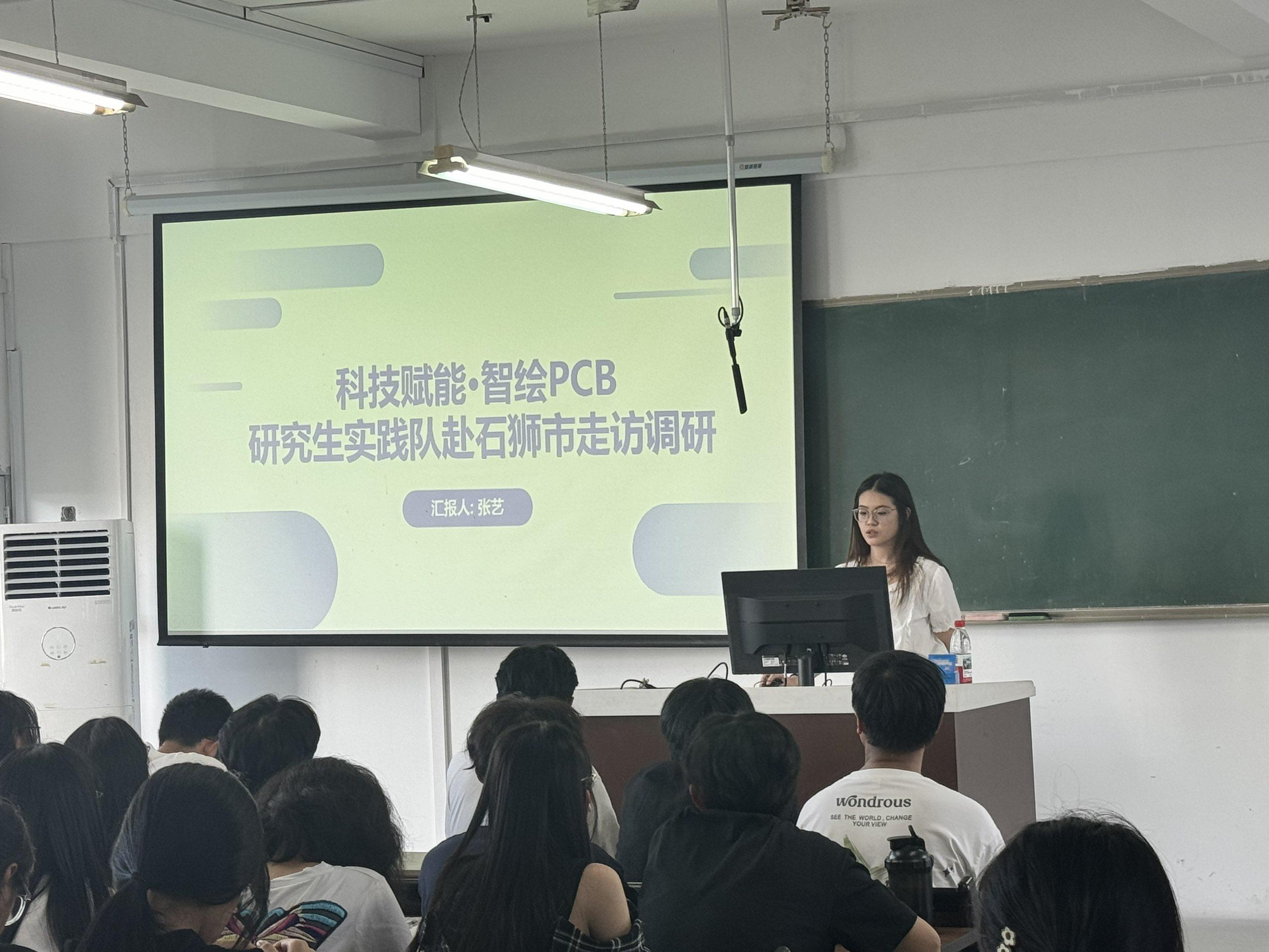 来自“科技赋能•智绘PCB”研究生实践队的张艺同学,首先向同学们系统阐述了“何为科技赋能”“科技赋能的核心价值”以及“如何高效实现科技赋能”。随后,她向同学们分享了活动内容,以图片与文字结合的方式直观地呈现了调研成效。