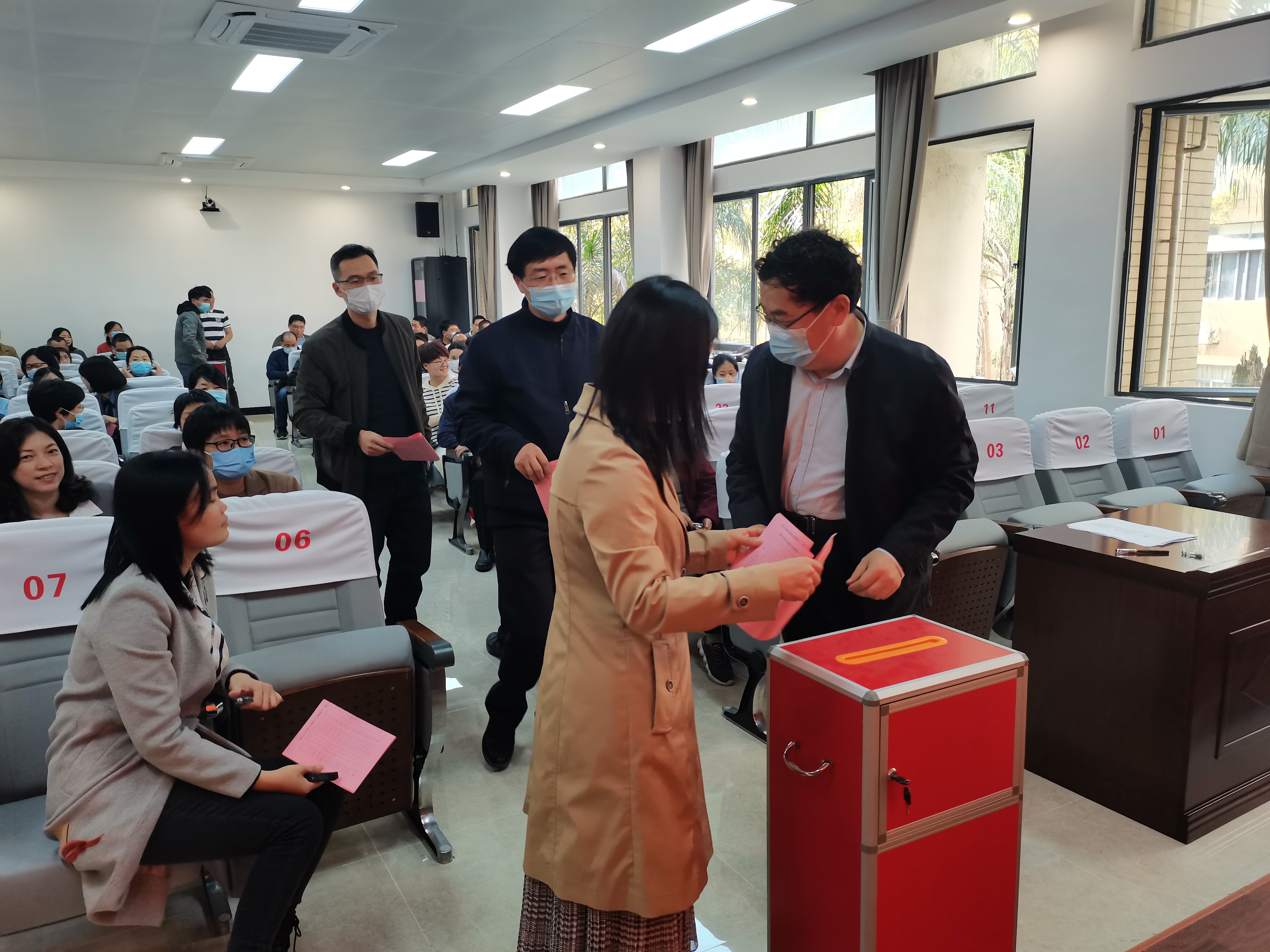 代表选举办法》(草案)。其次,大会通过总监票人、监票人、总计票人和计票人名单。总监票人颜芳杰老师宣读填写注意事项,与会人员认真选举并投入庄严一票。