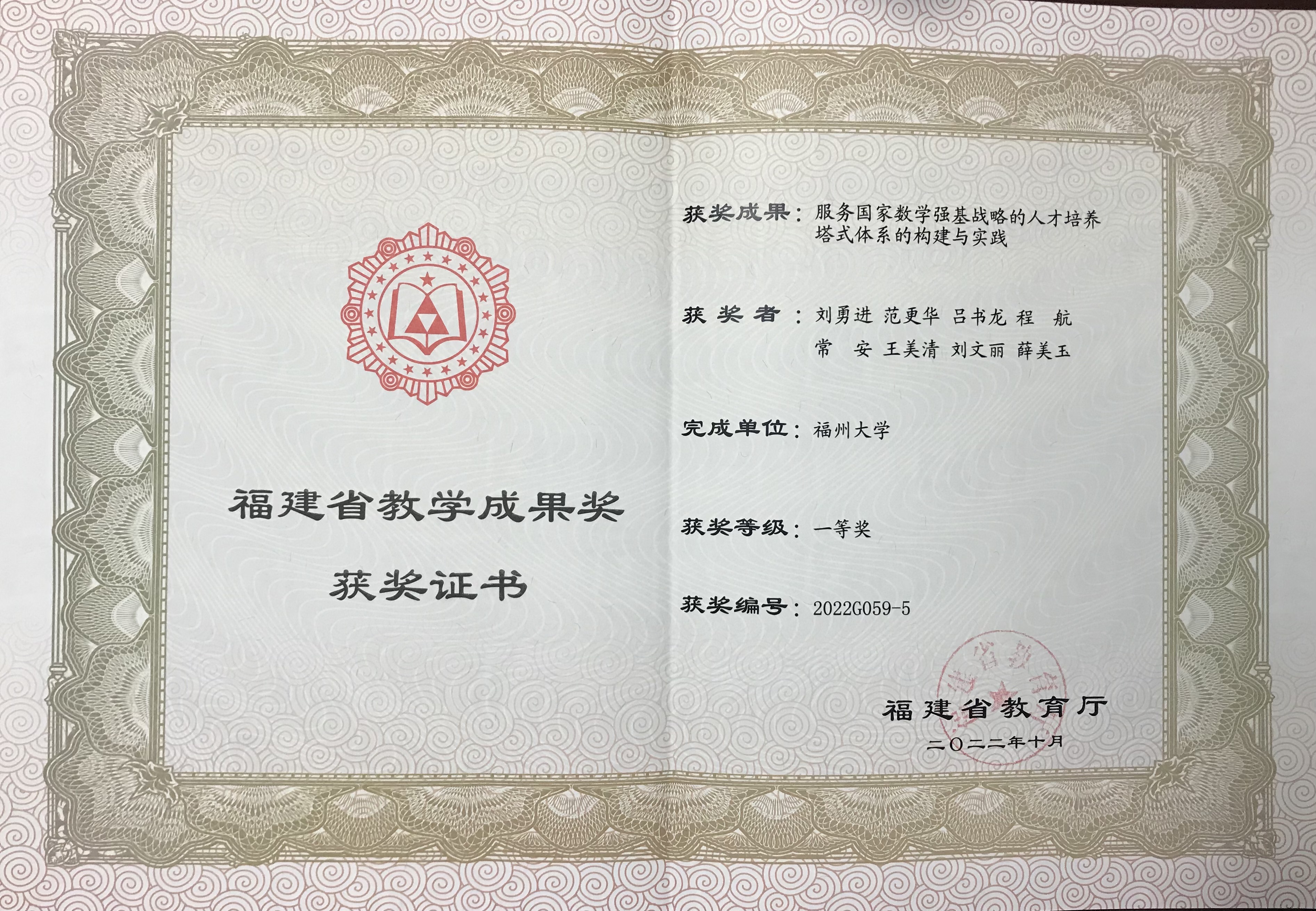 科研成果2:服务国家数学强基战略的人才培养塔式体系的构建与实践,获福建省高等教育教学成果一等奖。该成果基于“学生发展为中心”和服务“双一流”建设及国家数学强基战略,制定了数学学科服务“复合型、创新型和拔尖型”的塔式人才培养的体系架构和具体措施,培养的学生整体素质高,特别是数学基础扎实、数学应用水平高、创新意识浓厚、学科交叉融合好,在各类学科竞赛中成绩突出。其成果对全省人才培养模式改革具有较强的示范作用。
