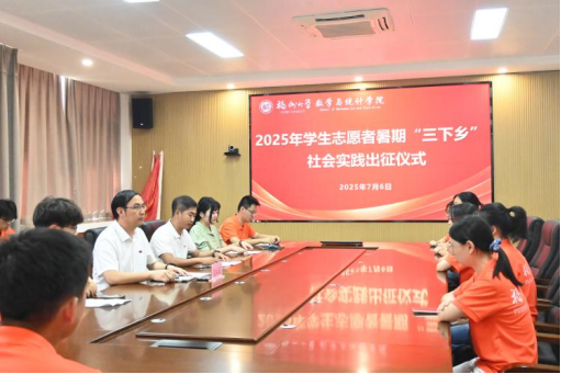 为全面深入学习宣传贯彻习近平新时代中国特色社会主义思想,积极引导和助力广大青年学生上好与现实紧密结合的“大思政课”,在社会实践中受教育、长才干、作贡献,7月6日,爱情岛论坛 2025年学生志愿者暑期“三下乡”社会实践活动出征仪式在数统楼312会议室举行。学院党委副书记蓝荣聪、辅导员许佳琦以及实践队学生志愿者代表出席本次出征仪式。仪式由院团委副书记沈成平主持。
