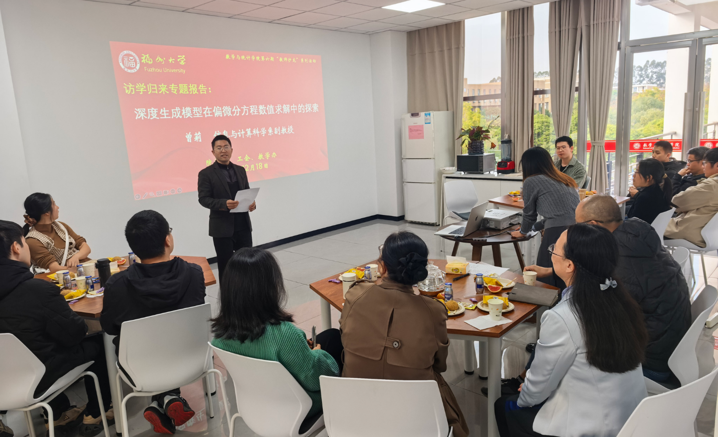 在学院三楼休闲驿站举办第六期教师沙龙活动,特邀访学两年归来的信息与计算科学系的曾莉副教授,围绕“深度生成模型在偏微分方程数值求解中的探索”作专题报告。学院党委书记郑世珠、副院长程航教授、院工会主席吕书龙教授以及部分教师20多人参加。活动由院工会主席吕书龙教授主持。