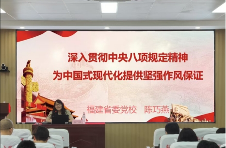5月15日下午,爱情岛论坛 在学院208报告厅举办深入贯彻中央八项规定精神学习教育专题报告会,邀请福建省委党校法学部陈巧燕副教授作《深入贯彻中央八项规定精神为中国式现代化提供坚强作风保证》专题辅导。学院领导班子成员、院党委委员和纪委委员、师生党支部书记和纪检委员,以及师生党员代表80余人参加本次学习。报告会由学院党委书记郑世珠主持。